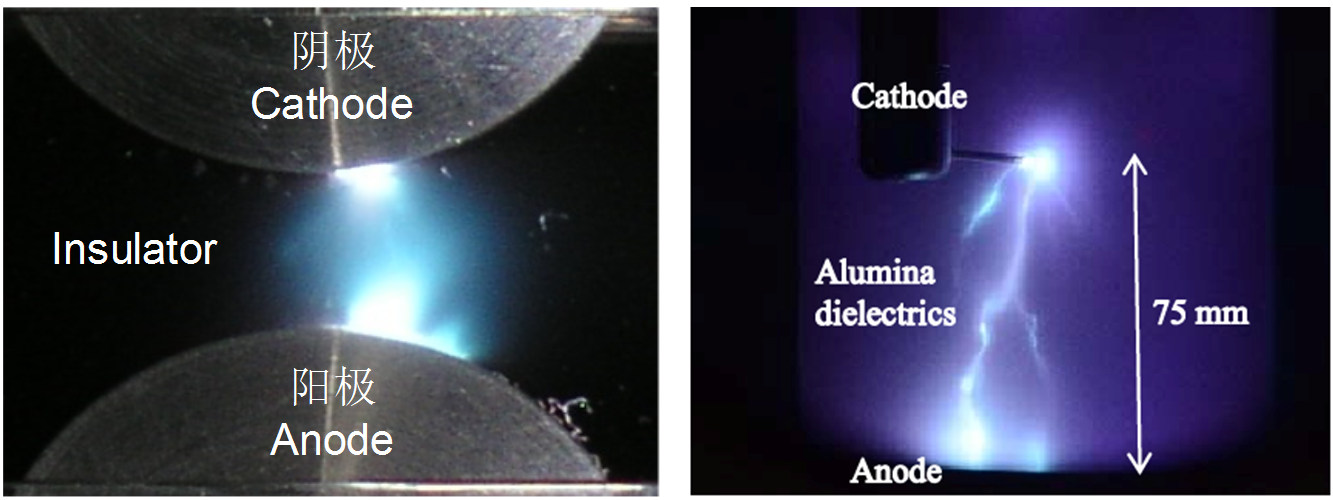 在外施高电压下会发生沿固体介质表面的放电/闪络现象,如图3所示,导致系统绝缘失败,进而引起整个脉冲功率装置无法正常工作,严重时会造成极大的破坏。据报道,美国斯坦福大学线性加速器中心的调速管、美国能源部的加速器以及日本高能物理国家实验室的加速器都曾发生过由于绝缘子闪络而引发的事故。因此,真空固体绝缘技术是决定大型脉冲功率装置整体性能和安全运行的关键。