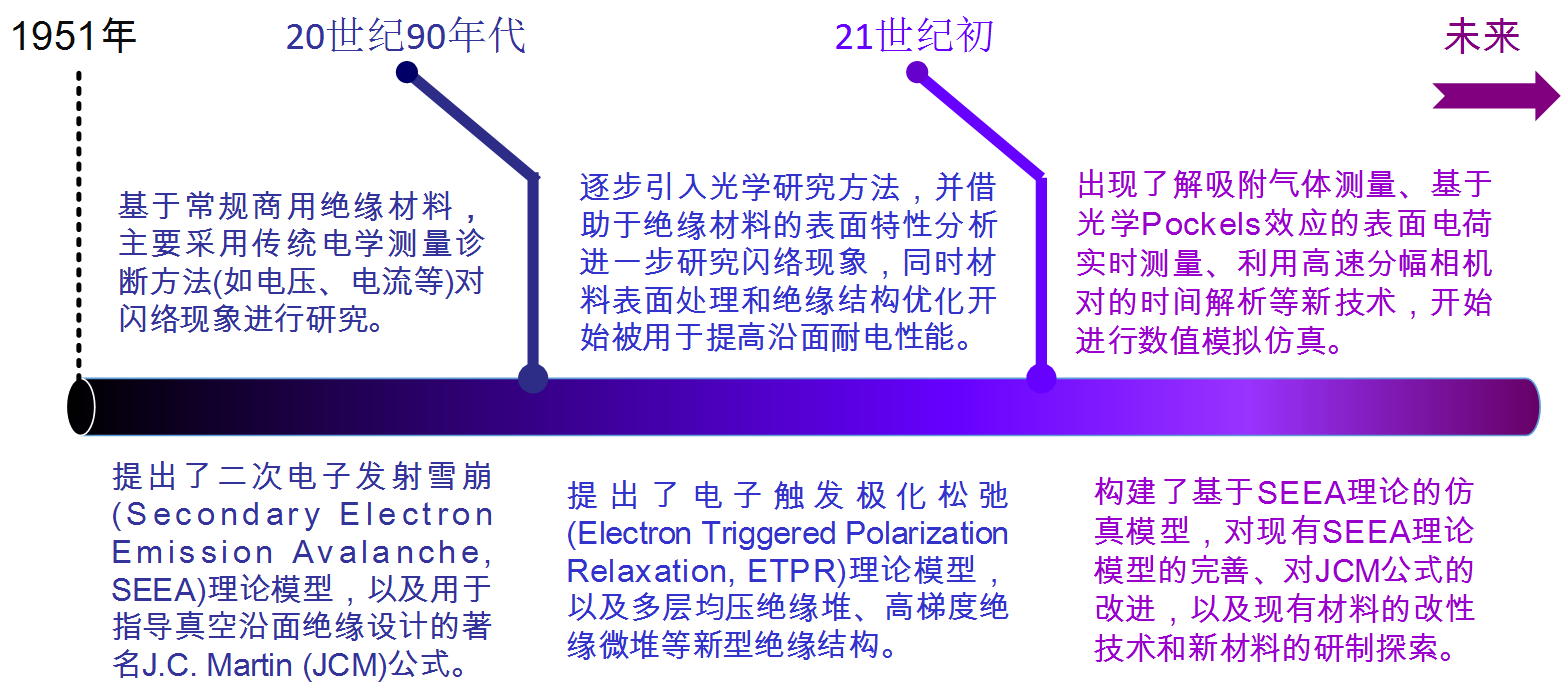 真空沿面闪络的研究历程:国际上对真空沿面闪络现象的研究最早可追溯到20世纪50年代,美国西屋(Westinghouse)研究实验室Gleichauf于1951年发表论文首次讨论了固体介质沿面闪络问题,揭示了闪络现象的复杂性,从此拉开了研究真空沿面闪络现象的大幕。此后至今60多年间,国内外众多学者纷纷加入进行了持续的研究,主要在真空沿面闪络的现象与特性、影响因素、产生和发展机理、改善抑制技术等方面做了大量工作。该论文将闪络的研究历程粗略地分为了三个时期,并总结了各时期闪络研究的特点和主要成就,如图4所示。