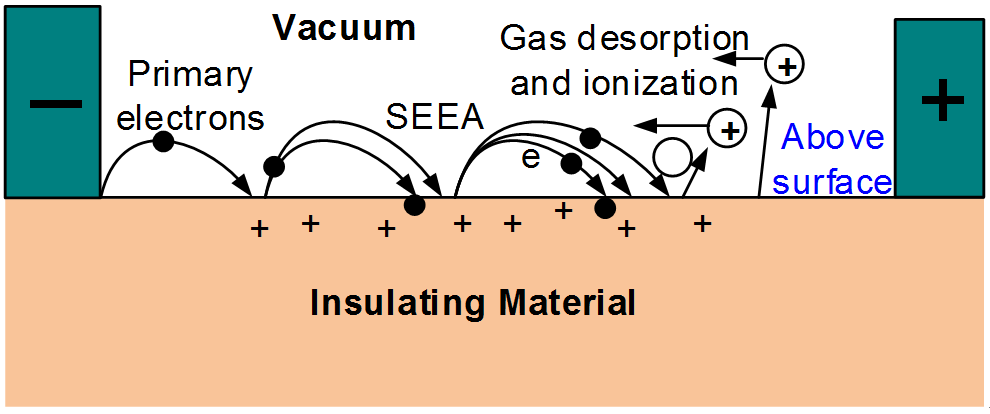 真空沿面闪络的机理:关于闪络的主流理论模型有二次电子发射雪崩(SEEA)模型和电子触发的极化松弛(ETPR)模型。目前,学者对SEEA模型更为认可,该模型强调从阴极三结合点处(Cathode Triple Junction, CTJ)处发射的初始电子碰撞绝缘介质表面引起二次电子发射,继而导致电子崩,产生表面吸附气体解吸附、电离雪崩而引发贯通性击穿现象,如图7所示。