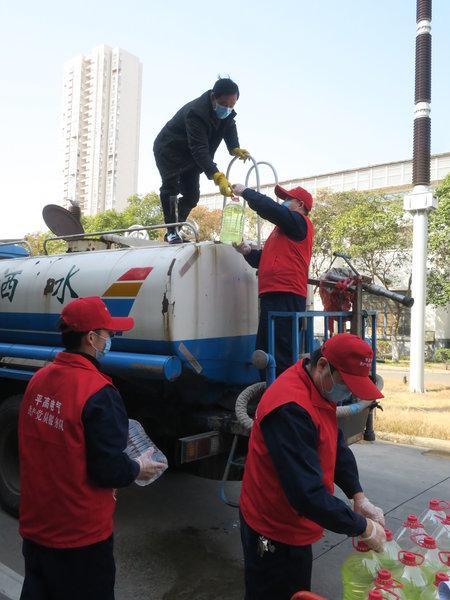 电镀分厂是平高集团金属表面涂敷和污水处理的大型专业现代化工厂,拥有多项在国内同行业中处于领先地位的技术成果。面对疫情的严峻形势,分厂紧急动员,在具有通风设备及防渗漏措施的滚镀银生产线围堰区,利用分厂水处理系统提取净化水,作业人员全部佩戴直接式防毒面罩(半面罩)、穿耐腐蚀工作服、戴橡胶手套、戴防飞溅眼镜等防护用品,根据次氯酸钠消毒液的浓度,计算次氯酸钠原液和水的需要量,填写消毒液配制记录表,检查塑料桶标识浓度与配制浓度一致性,确保容器的密闭性,并在容器上牢固贴上清晰的标志,内容包括名称、消毒液浓度、重量、配制日期、有效期、安全提示、应急处理等内容,以及国家标准规定的“腐蚀性物质”、“氧化性物质”、“向上”等标志标签。并通过扫描二维码形式,实现无接触向各复工单位分发,足量保证每天9000升地面消毒、150升公共区域消毒、200升物体表面擦拭消毒和50升垃圾桶消毒等四种浓度消毒液使用。目前,截止2月19日,已配置消毒液5000余公斤,库房尚存6000余升次氯酸钠原液,进过一定的专业处理,完全可以满足整个集团疫情防控3个月的使用量。