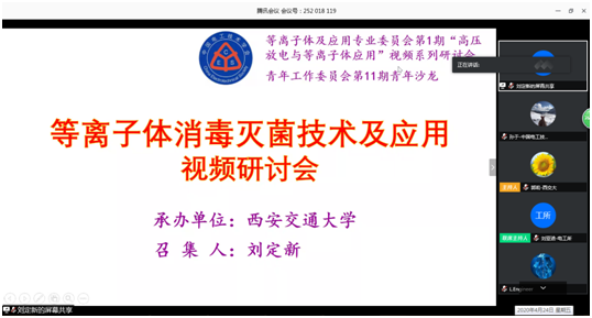 2020年4月24日上午9-12时,中国电工技术学会等离子体及应用专业委员会“高压放电与等离子体应用”系列视频研讨会(第1期)暨中国电工技术学会青年工作委员会第11期青年沙龙成功召开。视频会议聚焦“等离子体消毒灭菌技术及应用”,使用腾讯会议2个会场,并采用哔哩哔哩视频直播,共吸引了来自全国各地及欧洲、澳洲等国家和地区近500名科研单位学者、企业技术专家和研究生参会。活动得到西安交通大学的大力支持。出席本次会议的嘉宾有北部战区总医院原院长、全军重症(战)创伤主任侯明晓教授,华中科技大学国家杰青/长江学者卢新培教授、西安交通大学国家杰青张冠军教授、中国科学院电工研究所国家杰青邵涛研究员、中国电工技术学会青年工作委员会秘书长孙于博士和西安交通大学电气工程学院党委书记梁得亮教授。会议由西安交通大学刘定新教授主持。
