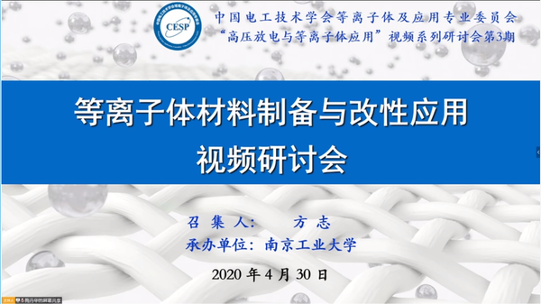 2020年4月30日下午2:00-5:30,中国电工技术学会等离子体及应用专业委员会“高压放电与等离子体应用”系列视频研讨会(第3期)成功召开。会议主题是“等离子体材料制备与改性应用”,由南京工业大学承办。本次会议采用腾讯视频会议和哔哩哔哩视频直播相结合的形式,共吸引了来自全国各地及欧洲、澳洲等国家和地区500余名科研单位学者、企业技术专家和研究生参会。会议由南京工业大学方志教授主持。