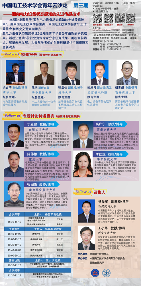 本期云沙龙聚焦“面向电力设备状态感知的先进传感技术”,由中国电工技术学会主办,中国电工技术学会青年工作委员会和西安交通大学承办,西安交通大学杨爱军副教授和王小华教授担任召集人,采用网络视频与在线直播会议形式。云沙龙特邀电力设备状态感知领域5位知名青年学者分享传感器技术最新研究成果,展开深度学术交流。活动还邀请5位行业资深学者分享研究成果、剖析行业热点、展望未来发展,为青年学者们的创新科研提供广阔视野和全新观点。