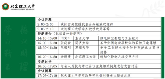 静电是准静止电荷、静电场和静电能量产生的一种物理现象,表现为静电力的吸附效应、静电场的电离效应、静电放电的辐射效应和静电能量释放的热效应等。静电危害是电子工业、火工品、航天航空等领域的主要灾害源之一,同时也可以利用静电服务于生产和生活,主要研究领域有静电放电和理论、静电防护技术与工程、静电测试和检测技术、静电应用技术等。本次会议由北京理工大学承办,得到了包括中国航天科技集团第五研究院514所、大连理工大学电气学院、浙江大学化学工程与生物工程学院、同济大学物理科学与工程学院、苏州天华超净科技股份有限公司、《高电压技术》和《High Voltage》编辑部、等离子体科学和能源转化北京市国际科技合作基地等多家单位的支持。会议邀请到了大连理工大学李杰教授、航天514所静电事业部部长季启政研究员作为特邀嘉宾参与访谈与点评,以及来自浙江大学闫克平教授、同济大学张晓青教授、苏州天华王荣刚博士、北京理工大学李鹏斐副教授这四位专家学者作特邀报告,研讨内容涉及静电除尘、静电驻极体、静电安全防护与静电人机交互四个方面。