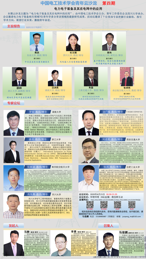 为加强本领域内学者的交流,碰撞学术思想,激发学术灵感,中国电工技术学会在此特殊时期主办主题为“电力电子装备及其在电网中的应用”的网络视频研讨会,会议由学会青年工作委员会马静教授、李勇教授发起,四川大学马俊鹏副研究员担任召集人。会议采取网络视频及在线直播的方式,邀请电力电子相关领域多位知名青年学者分享最新学术成果。活动还邀请了行业领军专家把握行业脉络,指引学术方向,展望行业未来,激励青年奋进。