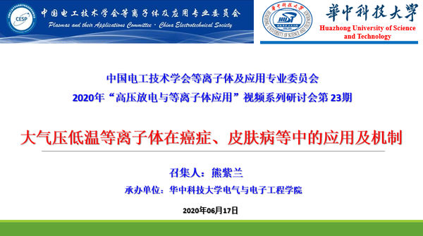 2020年6月17日上午9:00-12:10,由中国电工技术学会等离子体及应用专业委员会主办的2020年“高压放电与等离子体应用”视频系列研讨会第23期成功召开,会议主题为“大气压低温等离子体在癌症、皮肤病等中的应用及机制”,由华中科技大学承办。本次会议召集人为华中科技大学熊紫兰教授,会议采用“腾讯会议”进行线上学术交流,并通过“bilibili”进行同步直播,得到了来自高校、科研院所以及相关行业200余名专家和科研工作者的大力支持。