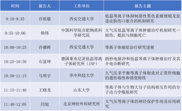 低温等离子体医学应用涉及低温等离子体的产生、传播,与物质的相互作用以及作用效果检测等在内的多方面内容,是多个学科交叉的新兴研究领域。其中,低温等离子体由于自身及其活化液相介质的高活性,在癌症治疗及皮肤病等中的应用尤其引人注目。为进一步推动大气压等离子生物医学领域的发展,加强学科间的交流与合作,本次会议邀请到了西安交通大学张冠军教授、华中科技大学卢新培教授、中科院电工所邵涛研究员作为特邀嘉宾致辞和对会议点评总结,以及西安交通大学许桂敏博士后、中国科学院合肥物质科学研究院韩伟研究员、西安交通大学许德晖副教授、德国莱布尼茨低温等离子体研究所(INP)石富坤博士、华中科技大学马明宇博士、山东大学王晓龙副研究员以及北京神经外科研究所闫旭副研究员做特邀报告。会议内容涉及了低温等离子体在促进皮肤伤口愈合、肿瘤治疗、与生物大分子和细胞的相互作用、神经保护作用等方面的研究成果。
