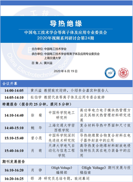 2020年6月19日下午14:00-16:30,中国电工技术学会等离子体及应用专业委员会系列视频研讨会(第24期)成功召开。会议主题是“导热绝缘”,会议由上海交通大学承办。本次会议采用腾讯视频会议和哔哩哔哩视频直播相结合的形式,得到了来自国内外高校及科研院所的专家和科研工作者的大力支持,共有260余人加入会议室交流,2000余人观看了线上直播。会议由上海交通大学黄兴溢教授主持。