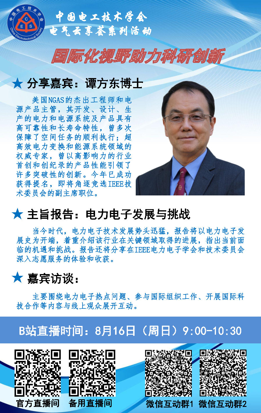 本期“电气云享荟”聚焦“国际化视野助力科研创新”,特邀IEEE技术委员会副主席候选人、美国NGAS公司电源产品主管、电力电子与能源系统领域资深专家谭方东博士分享电力电子领域最新研究成果、应用动态和科研体会,并针对当前技术热点、参与国际组织、国际科技合作等展开深度交流,积极搭建全球化科研合作伙伴关系,强化与国际组织合作共赢,为科研创新打开国际视野。