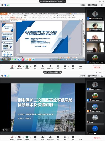 2021年3月4日,我会采用网络视频形式,对国网河北省电力有限公司检修分公司牵头完成的“高压断路器操动机构非侵入式检测及多信息融合故障诊断技术应用”和“继电保护二次回路高效率低风险检修技术及装置研制”两个项目,组织召开了科技成果鉴定会。鉴定会由我会副秘书长高巍博士主持,国网河北检修公司付炜平总工程师参加会议并致辞。