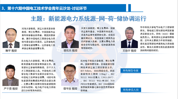 在专家访谈环节,河海大学鞠平教授、天津大学贾宏杰教授、华中科技大学文劲宇教授、东北电力大学严干贵教授、杭州电子科技大学曾平良教授等5位电工领域资深专家探讨了本领域的学术前沿动态与研究热点。专家们结合自身多年从事科学研究的经历,围绕“新能源电力系统源-网-荷-储协调运行”这一主题与青年学者进行了交流与互动,为青年学者指引学术方向,把握前沿动态,展望领域未来,激励青年学者担当奋进;河海大学鞠平教授首先简要介绍了广义负荷智能认知与高效调控的重要性,并分享了广义负荷智能认知与高效调控的整体研究框架以及主要的研究思路,并介绍了当前广义负荷研究的关键瓶颈和突破点;天津大学贾宏杰教授首先介绍了当前我国面临的巨大的减碳压力,并结合我国国情分析了我国实现双碳目标过程中存在的优势和劣势,详细介绍了综合能源系统相关技术和新型电力系统在我国实现双碳目标过程中起到的关键作用;华中科技大学文劲宇教授结合团队工作进展分享了大规模可再生能源并网消纳技术的最新研究成果,分享了他对未来直流输电发展的思考和建议,详细介绍了计算能源经济学的应用前景和潜力;东北电力大学严干贵教授分享了他对构建以新能源为主体的新型电力系统的看法,分析了高比例新能源和高比例电力电子化设备接入电力系统存在的难点,严干贵教授还详细介绍了东北电网新能源发展情况,介绍了未来中国新能源发展方向;杭州电子科技大学曾平良教授主要分享了双碳目标下电力系统面临的机遇与挑战,他简要介绍了双碳目标的实现途径和我国新能源资源分布情况,并从高比例新能源系统机制体制、系统构建、能源互联网、网络信息安全等方面分析了高比例新能源并网存在的技术挑战。