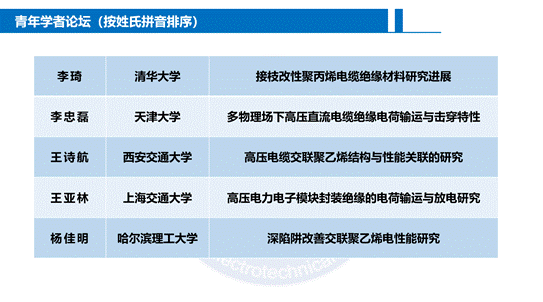 会议特邀了5位青年才俊,围绕高压电缆绝缘与空间电荷特性的前沿与热点做了精彩的学术报告,并回答了观众的问题。清华大学李琦副教授分享了接枝改性聚丙烯电缆绝缘材料的研究进展,提出了基于链结构控制和接枝改性的聚丙烯交流电缆绝缘的电学、机械和热性能协同调控。天津大学李忠磊副教授分享了极性翻转电压、机械应力等电-热-力多物理场下直流电缆绝缘空间电荷与击穿特性的研究进展,提出了基于聚丙烯半晶态聚合物微、介观聚集态结构调控的绝缘性能提升方法。西安交通大学王诗航助理教授分享了高压电缆交联聚乙烯结构与性能关联的研究进展,从电缆绝缘材料分子链结构、交联结构、结晶结构、界面结构等多级结构的角度出发分析了交联聚乙烯绝缘综合性能协同提升方法。上海交通大学王亚林助理教授分享了高压电力电子模块封装绝缘的电荷输运与局部放电研究进展,并介绍了电声脉冲法空间电荷与直流电导联合测量技术在电力电子封装绝缘等新兴领域的应用前景。哈尔滨理工大学杨佳明副教授分析了荷电点阵对交联聚乙烯电缆绝缘电性能的影响机制,并探讨剖析了接枝改性技术路线的工业生产适用性方案。