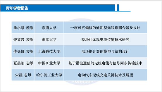 会议特邀了5位青年专家,围绕无线电能传输技术的前沿与热点做了精彩的学术报告,并回答了观众的问题。东南大学曲小慧教授分享了关于一族可抗偏移的通用型无线磁耦合器及设计的报告,提出了在变耦合与变负载下的无线电能传输补偿网络的优化设计方法。浙江大学钟文兴教授分享了关于模块化无线电能传输技术研究的报告,提出了用于超大功率无线电能传输系统的模块化设计方法以及相关理论。上海科技大学傅旻帆教授分享了关于电场耦合器的模型与结构设计的报告,从电场耦合式与磁场耦合式无线电能传输类比出发提出了统一的电场耦合无线电能传输的建模分析方法。中国矿业大学夏晨阳教授分享了关于基于谐波通信的无线电能与信号同步传输技术的报告,提出了多种基于高次谐波的无线电能与信号同步传输的理论与方法。哈尔滨工业大学宋凯教授分享了关于电动汽车无线充电关键技术及展望的报告,提出了在电动汽车无线电能传输系统中的关键技术以及亟待解决的挑战。