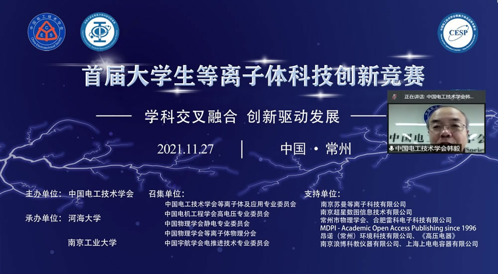 2021年11月27日,中国电工技术学会首届大学生等离子体科技创新竞赛决赛在常州顺利举行。本次竞赛由中国电工技术学会主办,河海大学、南京工业大学共同承办。中国电工技术学会韩毅秘书长,河海大学副校长董增川教授,中国科学院电工研究所研究员、等离子体专业委员会主任委员邵涛参加了决赛开幕式。开幕式由中国科学院电工研究所副研究员、等离子体专业委员会秘书长章程主持。