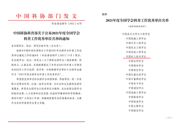 我会2021年科普工作再次获得中国科协的高度肯定,在中国科协近日公布的2021年度全国学会科普工作优秀单位名单上,继续榜上有名。