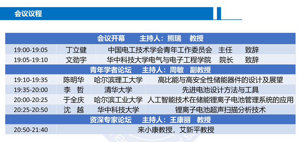 本期云沙龙主题为“新型电化学储能技术与应用”,主要聚焦于面向电力应用的电化学储能系统构建中的关键挑战,由中国电工技术学会青年工作委员会、华中科技大学强电磁工程与新技术国家重点实验室、华中科技大学先进电工材料与器件研究中心共同承办。学会青工委主任丁立健教授和华中科技大学电气与电子工程学院院长文劲宇教授致欢迎辞。中国电工技术学会青年工作委员会先进储能技术与应用主任熊瑞教授、王凯教授分别主持开、闭幕式。本期活动由召集人华中科技大学周敏副教授、王康丽教授主持。
