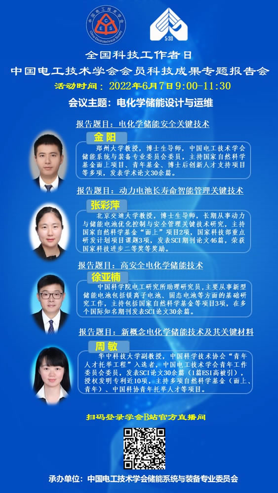 本期专题报告会主题为:“电化学储能设计与运维”。会议由中国电工技术学会储能系统与装备专业委员会承办,特邀请该专业领域的4位会员分享在各自研究领域所取得的成果,欢迎广大会员积极上线参会交流。