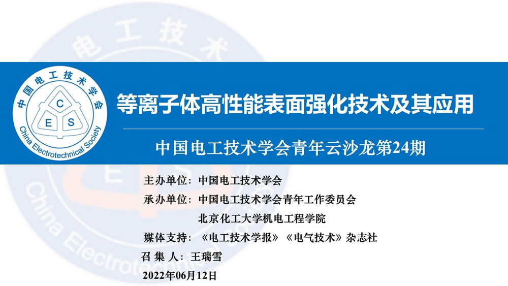 本期云沙龙主题为“等离子体高性能表面强化技术及其应用”,主要聚焦于面向等离子体高性能表面强化技术研究中的关键问题与挑战。本次会议由中国电工技术学会主办,中国电工技术学会青年工作委员会、北京化工大学共同承办。中国电工技术学会青年工作委员会主任丁立健教授和北京化工大学机电工程学院院长杨卫民教授致欢迎辞,中国电工技术学会青年工作委员会副主任黄兴溢教授致闭幕辞。本次会议开幕式由中国电工技术学会青年工作委员会副主任刘定新教授主持,本次会议青年专家论坛和资深专家论坛由会议召集人北京化工大学王瑞雪教授主持。