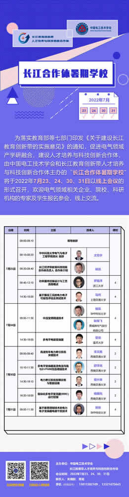 为落实教育部等七部门印发《关于建设长江教育创新带的实施意见》的通知、促进电气领域产学研融合、建设人才培养与科技创新合作体,由中国电工技术学会和长江教育创新带人才培养与科技创新合作体主办的“长江合作体暑期学校”将于2022年7月23、24、30、31日以线上会议的形式召开,欢迎报名参加。