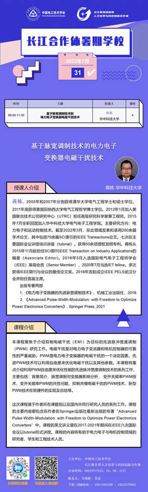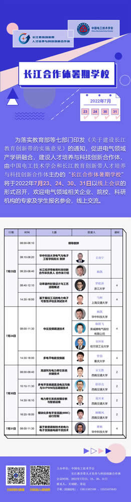 为落实教育部等七部门印发《关于建设长江教育创新带的实施意见》的通知、促进电气领域产学研融合、建设人才培养与科技创新合作体,由中国电工技术学会和长江教育创新带人才培养与科技创新合作体主办的“长江合作体暑期学校”第三期及第四期课程将分别于2022年7月30日和31日以线上会议的形式召开,欢迎报名参加。