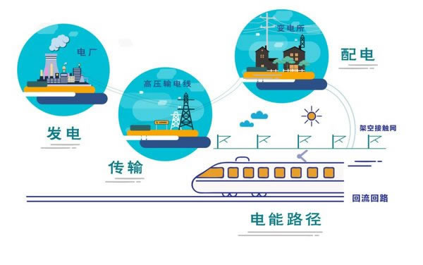 高铁本身是不带能源的,只能由电力牵引供电系统提供,供电系统主要由变电所和接触网构成。电厂发电后通过输电线路送到牵引变电站,再通过接触网将电供给铁路。如下图所示。