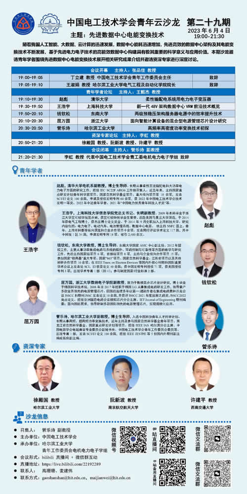 为加强本领域内学者的交流,碰撞学术思想,激发学术灵感,中国电工技术学会主办主题为“先进数据中心电能变换技术”的青年云沙龙。会议由哈尔滨工业大学电气学院管乐诗副教授担任召集人,中国电工技术学会青年工作委员会、哈尔滨工业大学电气工程及自动化学院共同承办。会议采取网络视频及在线直播的方式,邀请电气工程领域多位青年学者分享最新学术成果。活动还同时邀请了电气工程领域的资深专家,指引学术方向,展望发展未来。