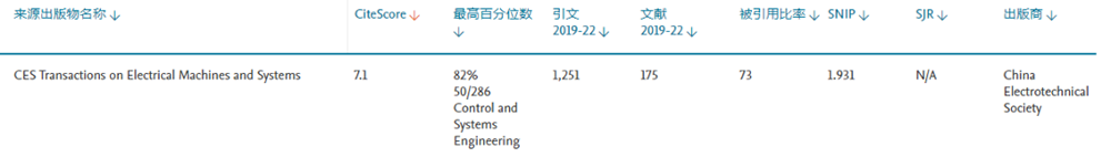 《中国电工技术学会电机与系统学报(英文)》(CES Transactions on Electrical Machines and Systems,以下简称CES TEMS)于2022年入选国际知名收录Scopus并于今年6月8日,收获期刊第一个CiteScore。根据Scopus官方网站(https://www.scopus.com/sources.uri)显示,CES TEMS的CiteScore得分为7.1,在多个所属领域均排名前18%。