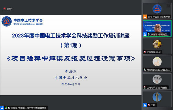 为帮助各理事单位、团体会员单位了解我会科技奖励工作相关要求,提高报奖材料质量,我会于2023年6月26日采用腾讯会议与哔哩哔哩视频直播相结合的方式成功举办2023年度中国电工技术学会科技奖励工作培训讲座(第1期)。本期讲座主题为《项目推荐书解读及报奖过程注意事项》,由我会咨询部业务主管李海军主讲。讲座吸引了来自高等院校、科研院所和企业的近千名电气工程领域科技工作者参会交流,清华大学、华中科技大学、上海交通大学、许继集团、平高集团、西安西电高压开关有限责任公司、山东电工电气集团有限公司、广东电网有限责任公司、南方电网超高压公司、北京智芯微电子科技有限公司等单位特别组织了集体学习。