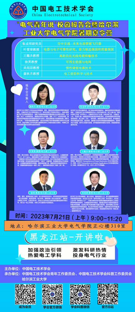 2023年7月21日,与您相聚黑龙江哈尔滨工业大学。欢迎电气工程领域广大院校师生、科研技术人员以及关心关注电气技术发展的各界人士积极参加!