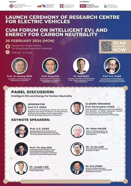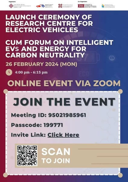 香港理工大学电动汽车研究中心成立庆典暨研讨会将于2024年2月26日召开,国内外著名专家作主旨演讲,诚邀您登入ZOOM线上参会。