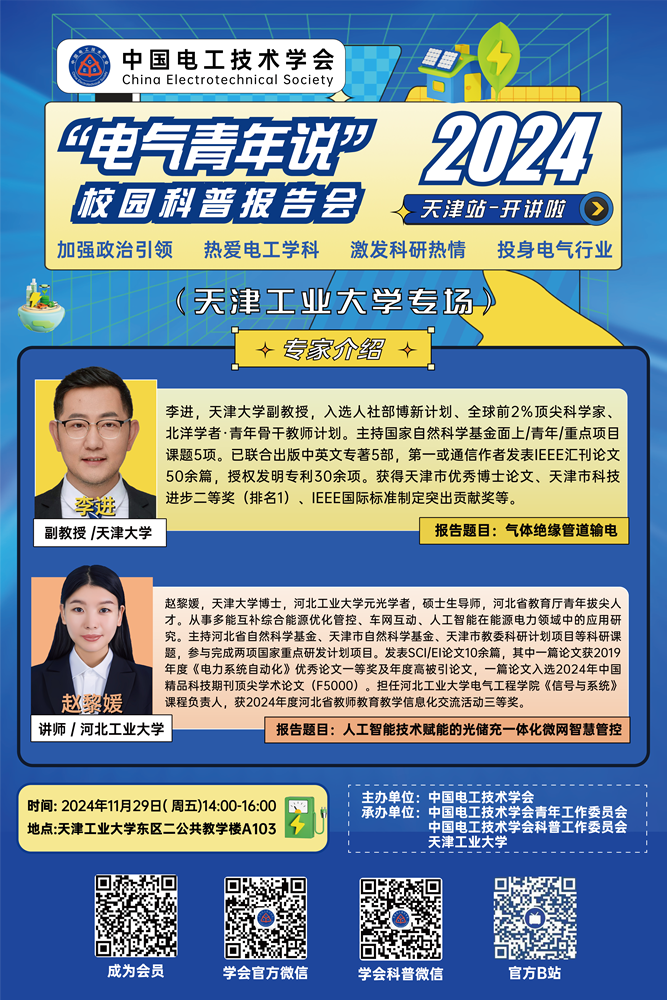 2024年“电气青年说”第六场校园科普报告会·天津站天津工业大学专场将于11月29日在天津工业大学东区二公共教学楼A103举办,精彩内容,敬请期待。