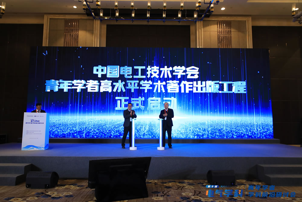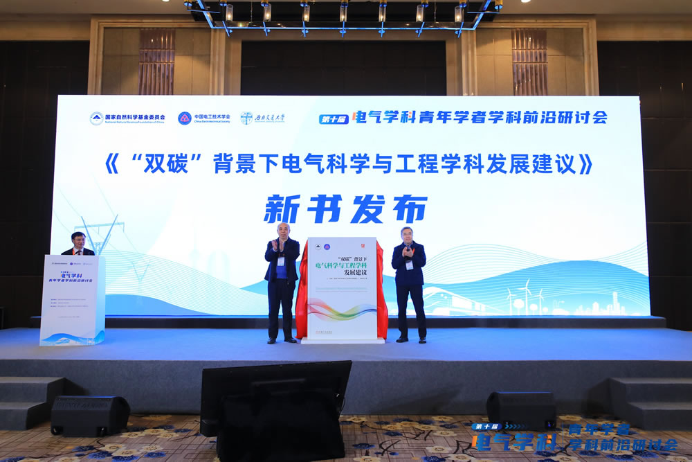 与会领导、专家和青年学者共同见证《“双碳”背景下电气科学与工程学科发展建议》一书的正式出版,郑雁军主任、杨庆新理事长共同为新书揭幕。韩毅秘书长、丁立健主任共同启动“中国电工技术学会青年学者高水平学术著作出版工程”项目。