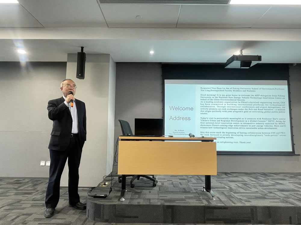 中国电工技术学会秘书长韩毅首先对北京大学政府管理学院MPP项目师生表示欢迎。韩毅秘书长强调了学会始终致力于搭建国际交流平台,促进“一带一路”倡议下的科技交流,并期待未来与北京大学政管院在跨界人才培养方面展开深度合作。