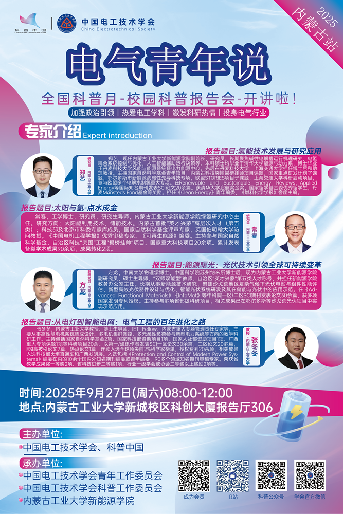 “电气青年说”第四场校园科普报告会——内蒙古工业大学专场,将于2025年9月27日在内蒙古工业大学新城校区科创大厦报告厅306举办。本场活动由内蒙古工业大学方龙副研究员担任召集人,内蒙古工业大学新能源学院承办。