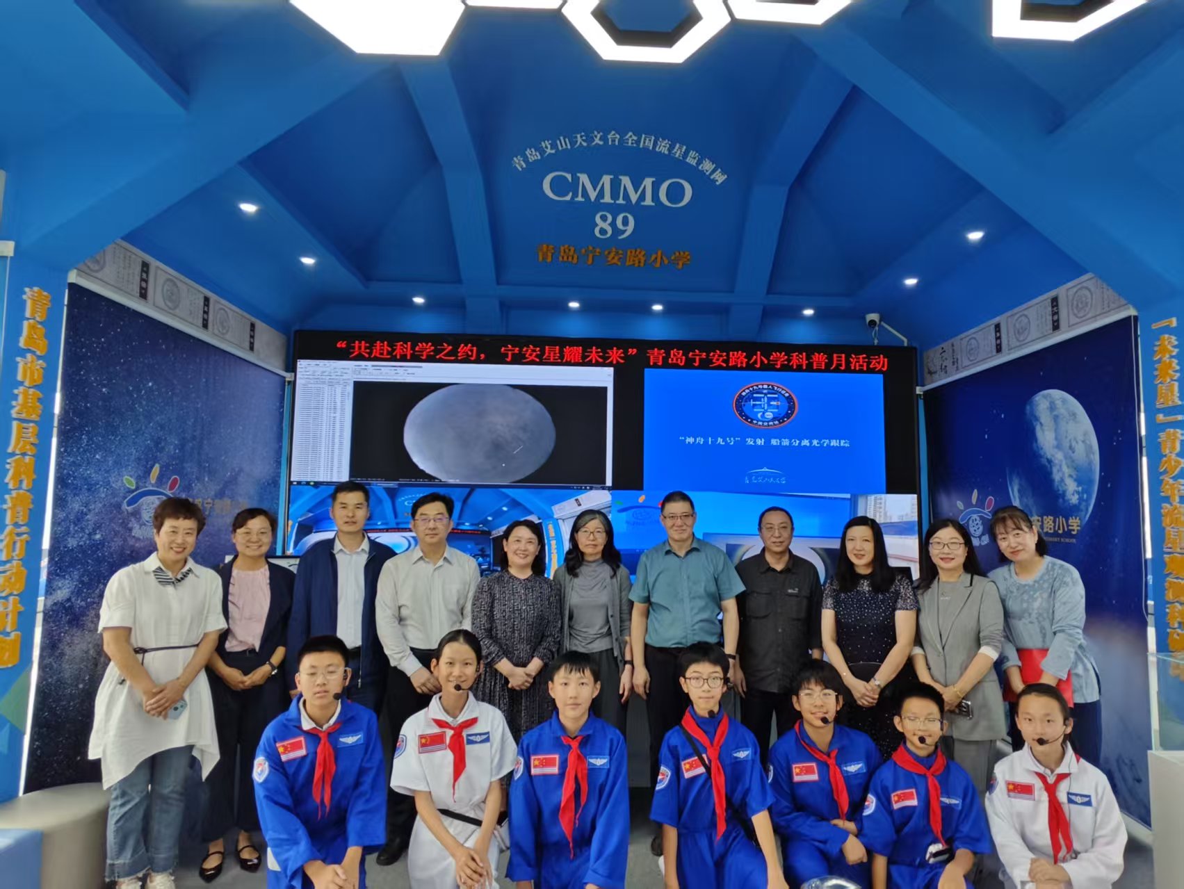 活动伊始,在同学们的生动讲解下,与会嘉宾和师生共同参观了学校“星河璀璨、探秘宇宙”天文空间展、“未来星”CMMO89流星观测科研站以及“九天揽月,筑梦星辰”月球模型展。一系列富有创意的天文科普展示,不仅展现了学校在科学教育方面的特色成果,也点燃了孩子们探索宇宙、走近科学的热情。