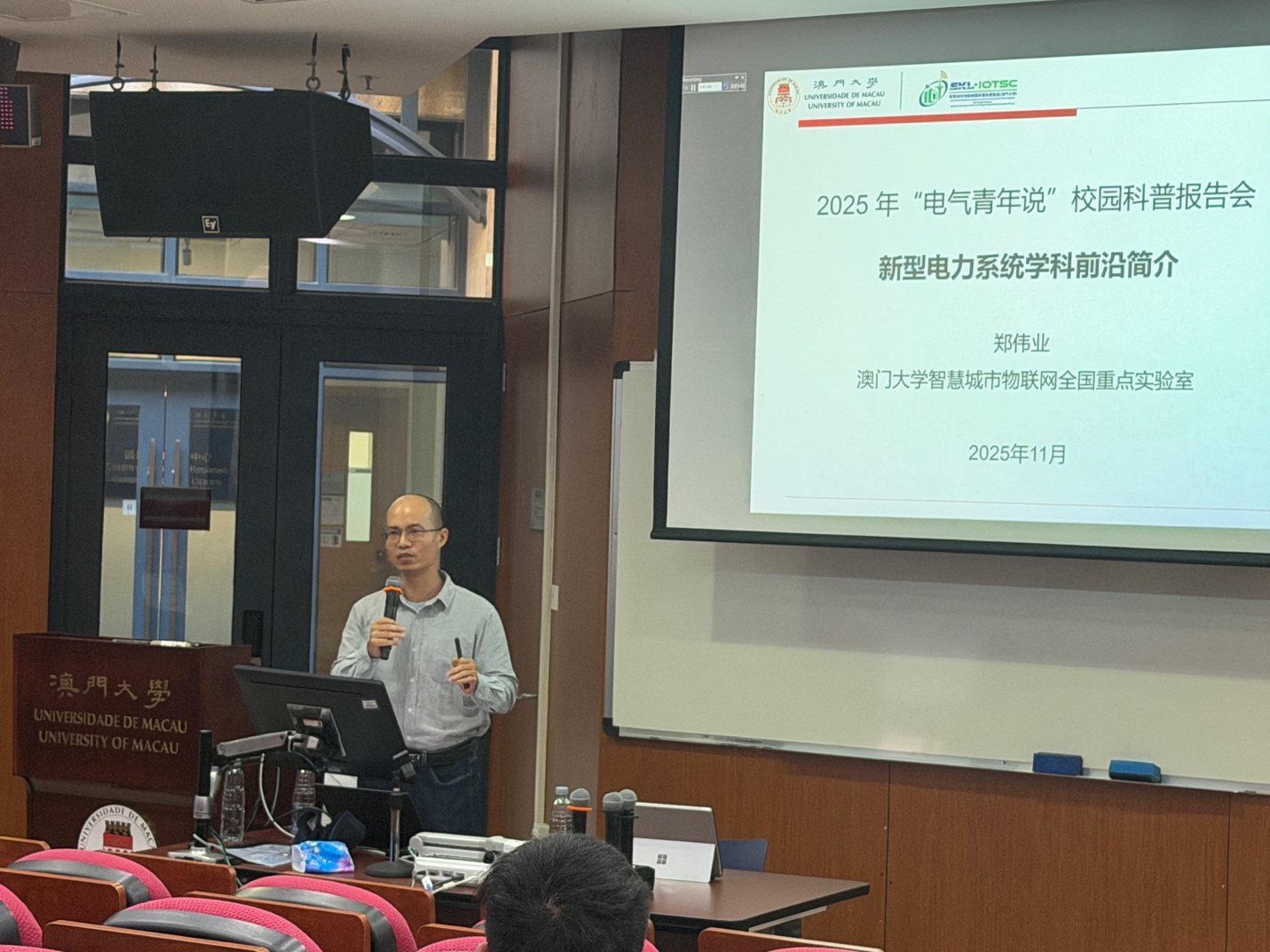 2025年11月8日,由中国电工技术学会与科普中国主办,澳门大学学生会工程及科技学会香港分会青年会员部澳门学生支部承办的“电气青年说”校园科普报告会,在澳门大学科技学院学术报告厅顺利举行。本次活动由澳门大学刘景荣助理教授主持,邀请了澳门大学张洪财副教授、杨阳助理教授、郑伟业助理教授进行专题分享与交流。
