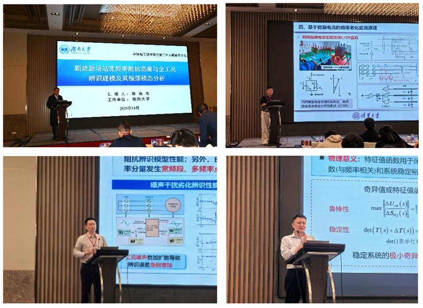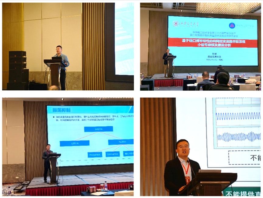 会议第一阶段,8位特邀专家作相关报告。湖南大学陈燕东教授作题为“新能源场站宽频带阻抗测量与全工况辨识建模及其振荡模态分析”的报告;清华大学张品佳教授作“基于微漏电流的电气设备绝缘在线感知理论与方法”的报告;浙江大学年珩教授作题为“计及频率耦合特性的新能源发电系统全工况阻抗测量方法”的报告;浙江大学辛焕海教授作题为“新型电力系统的动强度需求与广义短路比约束”的报告;郑州大学金阳教授作题为“储能系统多参量智能传感探测”的报告;西安交通大学刘增教授作题为“基于端口频率特性的构网型变流器并联系统小信号建模及振荡分析”的报告;南京南瑞继保电气有限公司马秀达高工作“柔性直流输电工程宽频振荡分析与抑制”的报告;国网四川省电力公司电力科学研究院姜晓锋高工作“川西弱电网场景稳定性分析与提升技术研究”的报告。