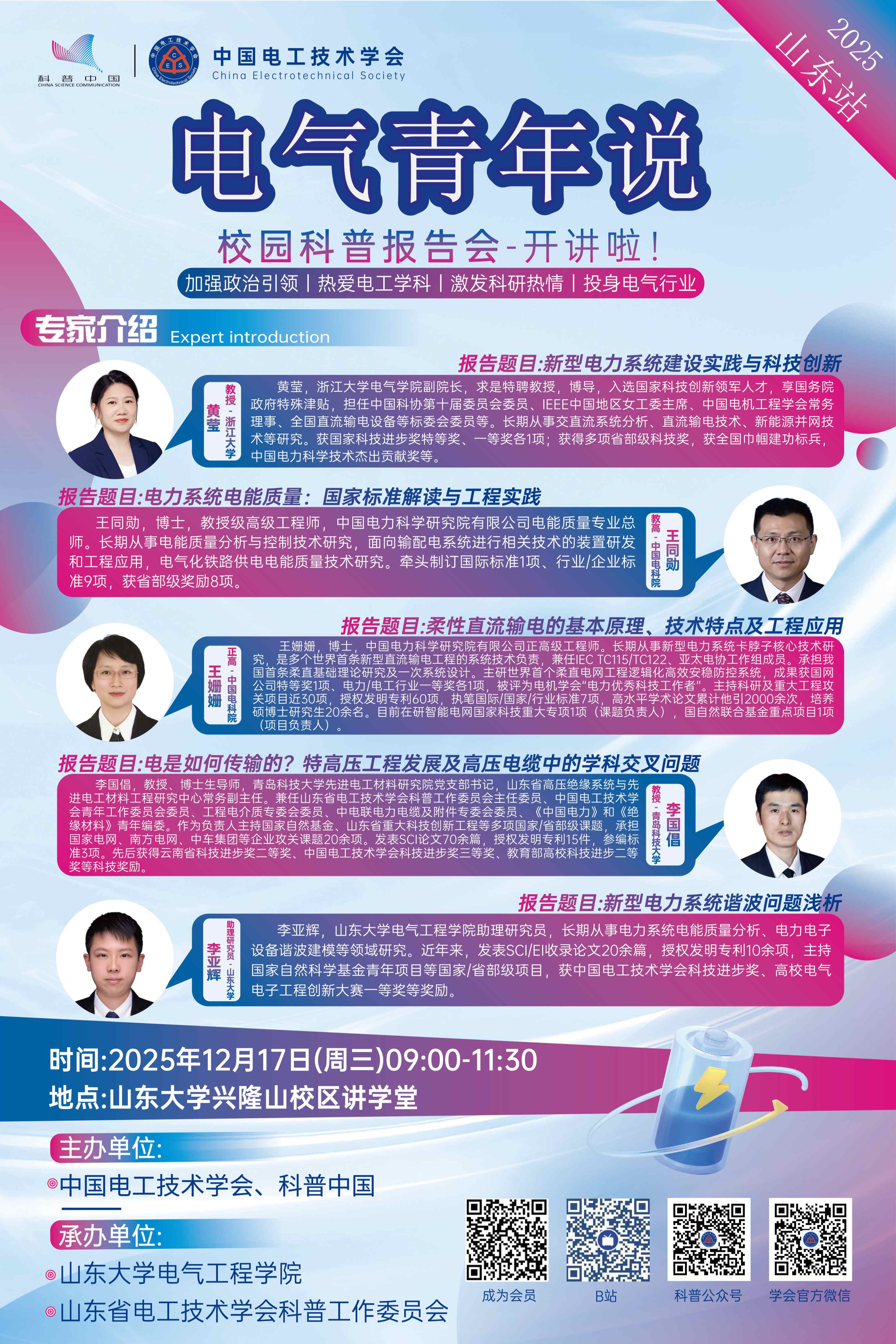 “电气青年说”校园科普报告会——山东大学专场,将于2025年12月17日在山东大学兴隆山校区讲学堂举办。本场活动是由山东大学电气工程学院孙媛媛副院长担任召集人,山东大学电气工程学院和山东省电工技术学会科普工作委员会共同承办。