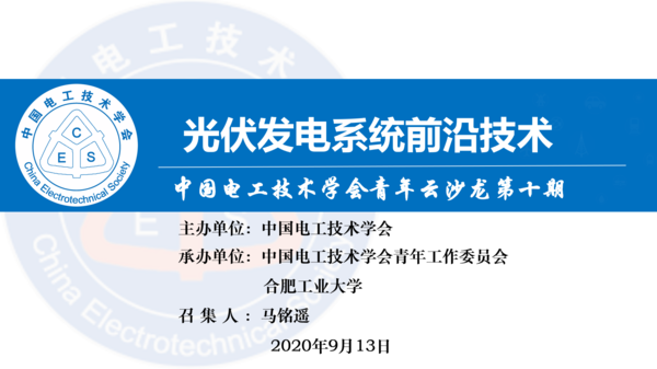 本期青年云沙龙聚焦“光伏发电系统前沿技术”,由中国电工技术学会主办,学会青年工作委员会和合肥工业大学承办。华北电力大学马静教授代表学会青工委主持了开幕式,中国电工技术学会李永建副秘书长、合肥工业大学电气与自动化工程学院院长丁立健教授分别致欢迎辞。合肥工业大学电气与自动化工程学院苏建徽教授和马铭遥教授分别主持了专家访谈环节和主题报告环节。最后,湖南大学李勇教授代表学会青工委致闭幕辞。