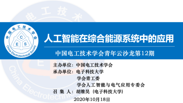 本期青年云沙龙聚焦“人工智能在综合能源系统中的应用”,由中国电工技术学会主办,电子科技大学、中国电工技术学会青年工作委员会、中国电工技术学会人工智能与电气应用专委会承办。电子科技大学校长曾勇教授,中国电工技术学会副秘书长、学会青工委主任丁立健教授,中国电工技术学会人工智能与电气应用专委会主任委员穆钢教授分别致欢迎辞。电子科技大学胡维昊教授致闭幕辞。本期活动召集人电子科技大学胡维昊教授主持了云沙龙活动。此次活动直播间人气值达1.6万。