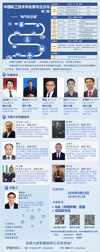 中国电工技术学会第二期青年云沙龙,由学会青年工作委员会马静教授、李勇教授发起,西南交通大学胡海涛教授担任召集人,采取网络视频与在线直播会议形式,特邀请电气化交通领域多位知名学者分享最新研究成果,展开深度交流。活动还邀请行业资深学者解惑当下热点、展望行业未来,指引青年创新科研梦、激励青年建功新时代。现将有关事项通知如下: