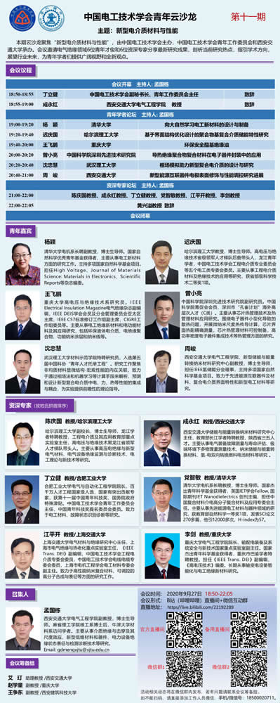 本期青年云沙龙聚焦“新型电介质材料与性能”,由中国电工技术学会主办,学会青年工作委员会和西安交通大学共同承办,西安交通大学孟国栋副教授担任召集人。会议采取网络视频及在线直播的方式,特邀请电气绝缘相关领域多位知名青年学者分享最新学术成果。活动还邀请了多位专业领军专家指引学术方向,把握产业脉络,展望行业未来,激励青年奋进。
