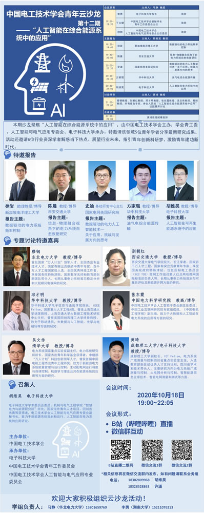 本期青年云沙龙聚焦“人工智能在综合能源系统中的应用”,由中国电工技术学会主办,中国电工技术学会青年工作委员会、中国电工技术学会人工智能与电气应用专业委员会和电子科技大学共同承办,电子科技大学胡维昊教授担任召集人。会议采取网络视频及在线直播的方式,特邀请电气人工智能相关领域多位知名青年学者分享最新学术成果。活动还邀请了多位专业领军专家指引学术方向,把握产业脉络,展望行业未来,激励青年奋进。