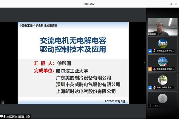 2020年12月5日,我会采用网络视频形式,对哈尔滨工业大学、广东美的制冷设备有限公司、深圳市英威腾电气股份有限公司和上海新时达电气股份有限公司4家单位共同完成的“交流电机无电解电容驱动控制技术及应用”项目组织召开了科技成果鉴定会。鉴定会由我会副秘书长高巍博士主持,中国电工技术学会副理事长、哈尔滨工业大学副校长徐殿国教授代表项目完成单位致辞并对项目成果进行汇报。