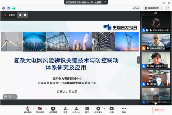 受云南电力调度控制中心和云南电网有限责任公司电网规划建设研究中心委托,我会于2021年3月9日对其共同完成的“复杂大电网风险辨识关键技术与防控联动体系研究及应用”项目进行了科技成果鉴定。全球能源互联网研究院有限公司院长汤广福院士担任鉴定委员会主任委员,清华大学电机系学术委员会主任、太原理工大学副校长孙宏斌教授和国网能源研究院有限公司副院长蒋莉萍教高担任副主任委员。鉴定会由我会副秘书长高巍博士主持,云南电网有限责任公司电网规划建设研究中心副总经理孙鹏代表完成单位讲话。