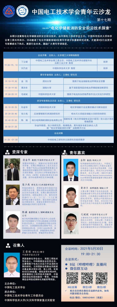 为加强本领域内学者的交流,碰撞学术思想,激发学术灵感,中国电工技术学会在此特殊时期主办主题为“电化学储能消防安全前沿技术探索”的网络视频研讨会。会议由中国科学技术大学王青松教授担任召集人,中国电工技术学会青年工作委员会、中国科学技术大学承办。会议采取网络视频及在线直播的方式,邀请电化学储能相关领域多位青年学者分享最新学术成果。活动还邀请了行业领军专家把握产业脉络,指引学术方向,展望行业未来,激励青年奋进。