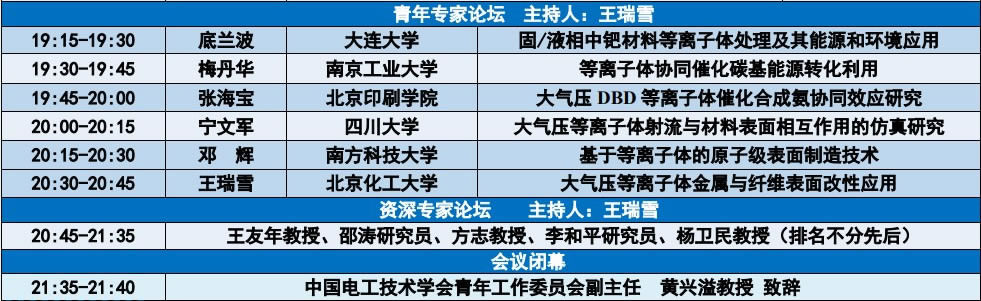 本期云沙龙主题为“等离子体高性能表面强化技术及其应用”,主要聚焦于面向等离子体高性能表面强化技术研究中的关键问题与挑战。本次会议由中国电工技术学会主办,中国电工技术学会青年工作委员会、北京化工大学共同承办。中国电工技术学会青年工作委员会主任丁立健教授和北京化工大学机电工程学院院长杨卫民教授致欢迎辞,中国电工技术学会青年工作委员会副主任黄兴溢教授致闭幕辞。本次会议开幕式由中国电工技术学会青年工作委员会副主任刘定新教授主持,本次会议青年专家论坛和资深专家论坛由会议召集人北京化工大学王瑞雪教授主持。