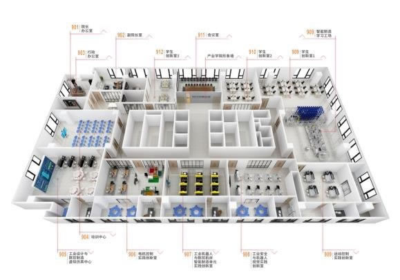 温州大学亚龙智能产业学院共 10 个功能区,包括智能设计中心、运动控制中心、工业数据处理中心、工业安全控制中心、智能物流技术中心、智能工装中心、驱动技术中心、工业机器人中心、智能生产线中心和培训中心。