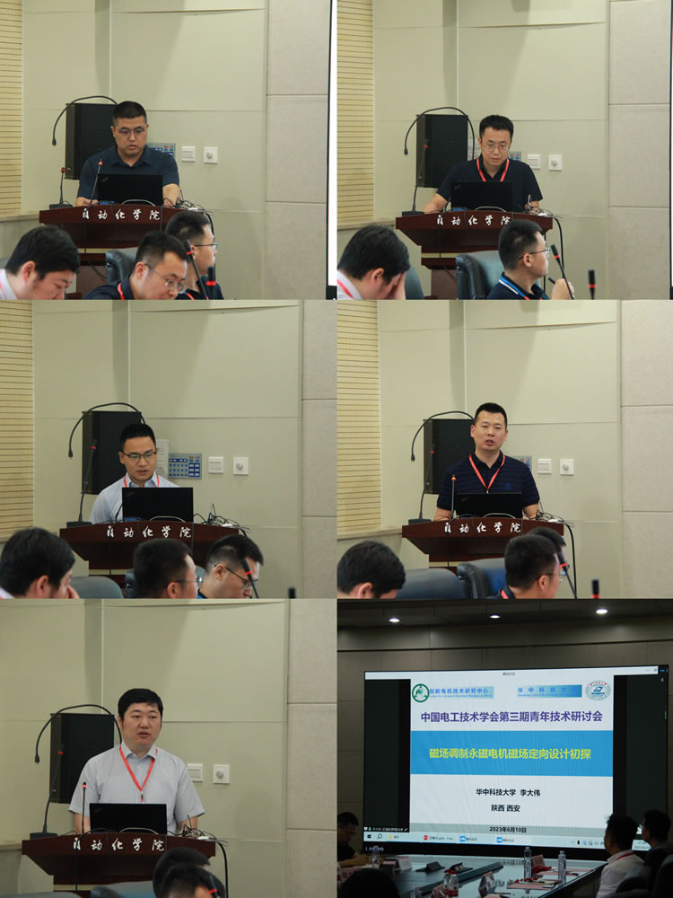 在报告环节,首先是青年行业专家的报告,分别是航天16所高级工程师曹宽带来的“航空发动机用电机技术研究”报告、航空工业618所高级工程师赵小鹏带来的“容错电机及其驱动系统关键技术研究”报告、航空工业115厂工程师何琪带来的“电动飞机电推进系统关键技术研究”报告;然后是青年知名学者的报告,分别是哈尔滨理工大学陶大军教授带来的“新型变相器基础理论研究与验证”报告,哈尔滨工业大学吴绍朋教授带来的“多时间尺度惯性储能电源技术”报告,华中科技大学李大伟教授带来的“磁场调制永磁电机磁场定向设计初探”报告。