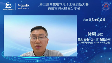 徐康总监在讲话中指出,施耐德电气积极响应“创新是第一动力,科技是第一生产力,人才是第一资源”科技创新强国理念,积极支持高校电气电子工程创新大赛,推动学会、企业和学校共同搭建创新驱动平台,促使同学们探索电气电子技术创新,激发同学们的创新潜力。